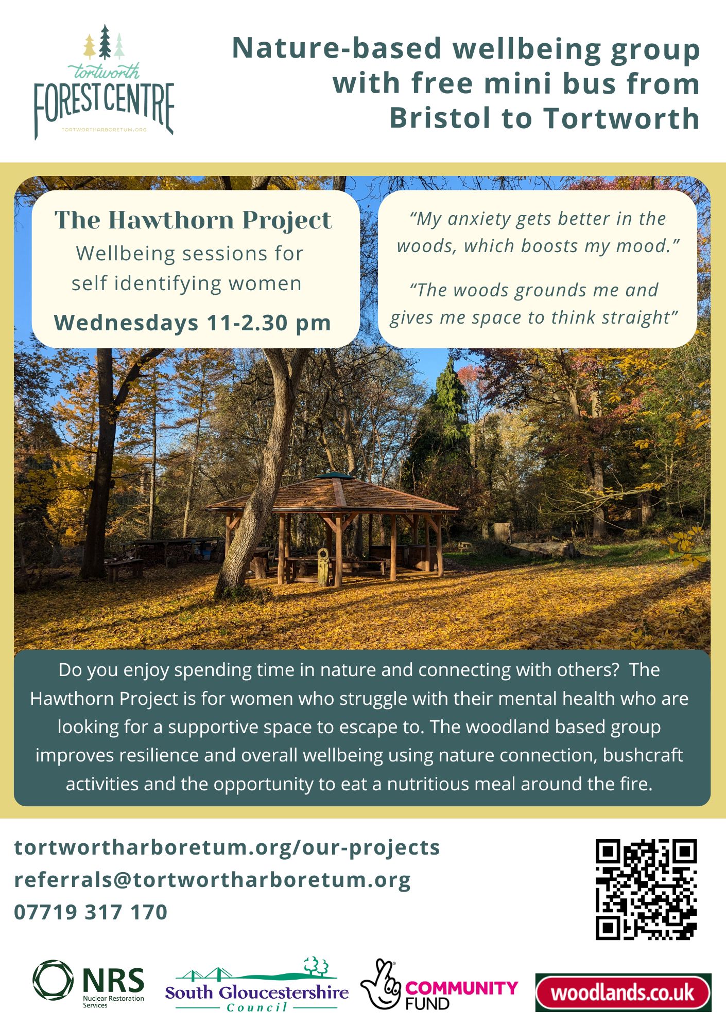 We currently have spaces in the Hawthorn Project – this is a nature based woodland wellbeing group for self identifying women who are 18+. The group is for any women who struggle with their mental health including people in recovery from drug and alcohol use. The group runs term time only on a Wednesday from 11-2.30pm. There is a free minibus that leaves central Bristol at 10.30 am and returns at 3pm.